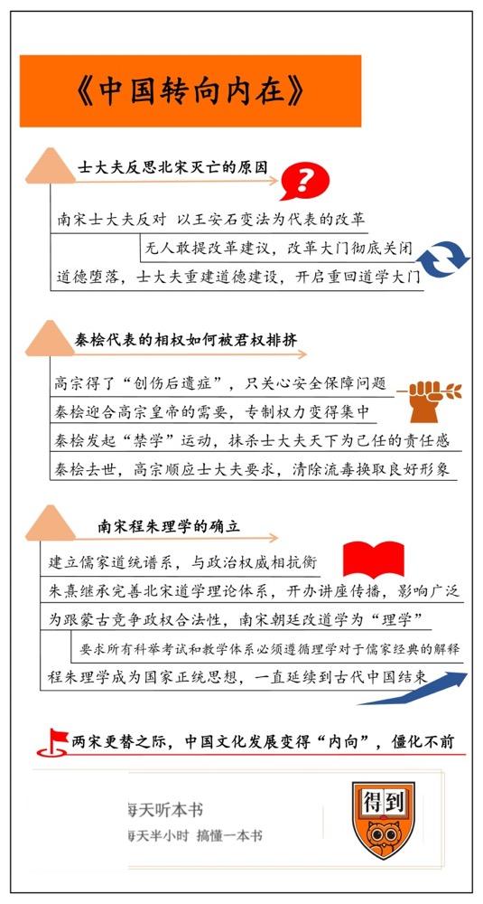 《中国转向内在》这本书,通过描绘北宋到南宋之间的政治变化和文化领域的互动,希望能够说明为何中国文化在南宋开始转向了内在,变得更加内敛和僵化。书中把这种转向分成了3步。