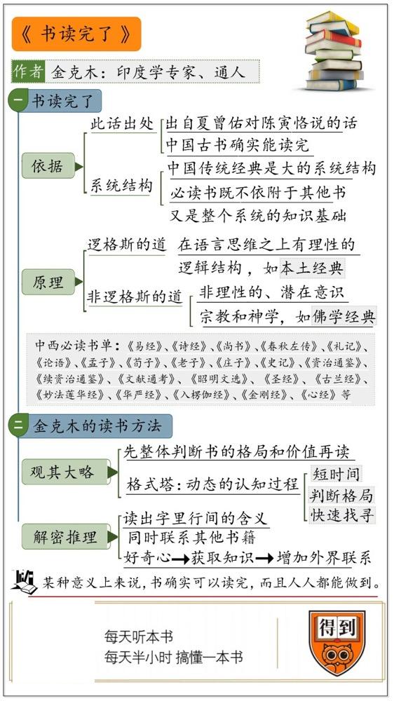 好,关于这本《书读完了》,我们就介绍到这儿,总结一下:这本书讲的是通才学者金克木的读书方法。首先,我们说的是该先读什么书:知识有系统结构,必读书的特征是既不依附于其他书,又是整个系统的知识基础。把中外文化中的这类书通读之后,就可以说是“书读完了”。中外文化都有两套体系,一套是偏重逻格斯 的道,也就是理性的知识。另一套是非逻格斯的道,也就是非理性的、潜在意识活跃的范畴,主要是宗教和神学。按照这个标准,金克木还开列了佛教经典的必读书目。