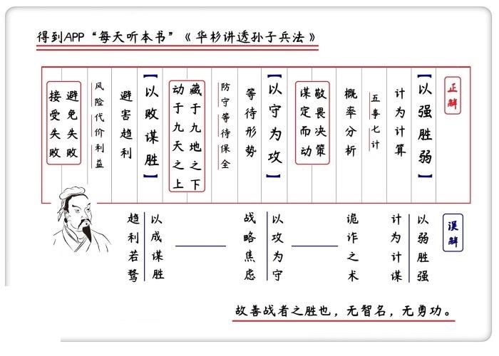 所以本书的作者华杉说,当你真正地去学习《孙子兵法》之前,你可能以为这是一部教你怎么取胜的秘籍,它当然也是,但是,如果你在兵法中学会了接受失败,才算是真正看懂了这本书。