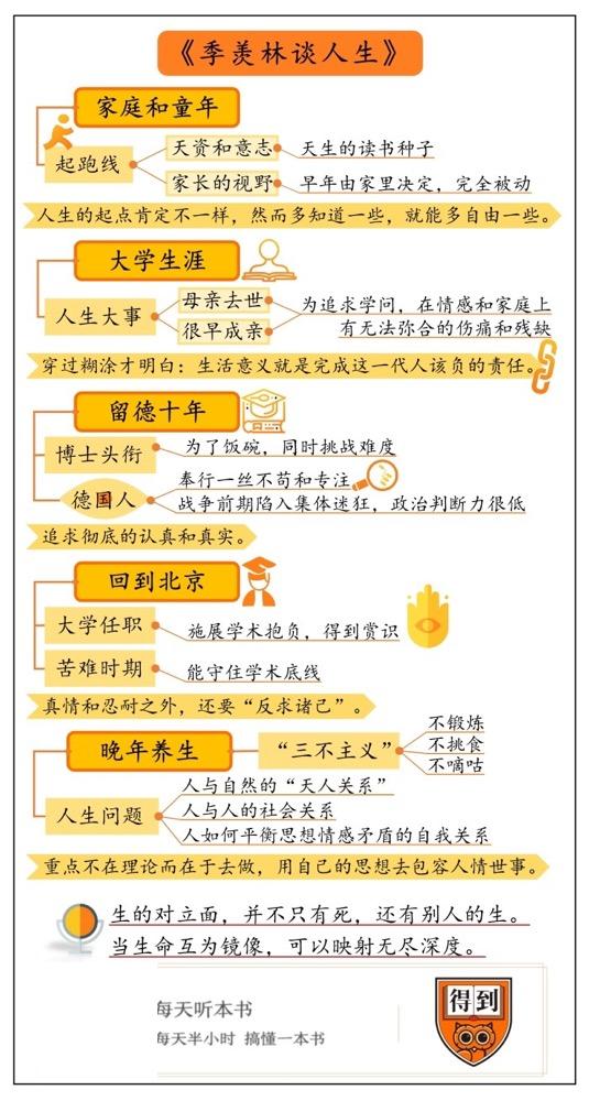 我把这些内容整理成了一份他的人生清单:左边一列内容,来自他的日记和回忆录。右边一列,大部分是他晚年随笔杂文里做的回顾和反思。如果给这份清单取个名字,可以借用他另一本散文集的书名《我的心是一面镜子》。他在九十岁时还是说:“什么叫人生?我不清楚。我看芸芸众生中,也没有哪个人真清楚。我们的诞生都是被动的。”生的对立面,并不只有死,还有别人的生。当生命互为镜像,可以映射无尽深度。这也是我为 你讲这本书的目标:在季羡林的心灵历程里,照出我们自己的样子。