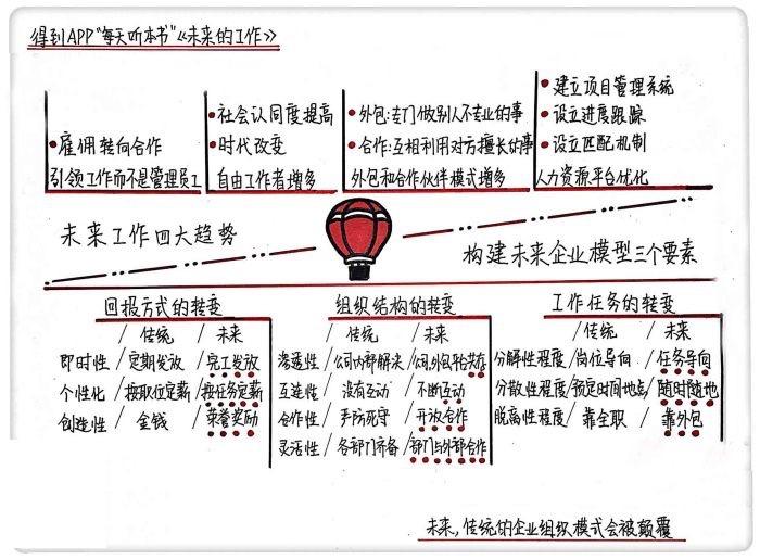 我们回顾一下,在这本书里,作者给我们梳理了在个体价值迅速崛起的时代,未来的工作出现了4种趋势,分别是引领工作而不是管理员工、自由工作者的增加、外包和合作伙伴模式越来越多、人力资源平台越来越完善。公司管理者为了顺应这个趋势,可以从工作任务、组织结构和回报方式三个要素来建构自己的工作模型,来满足人力资源工作的未来需求。