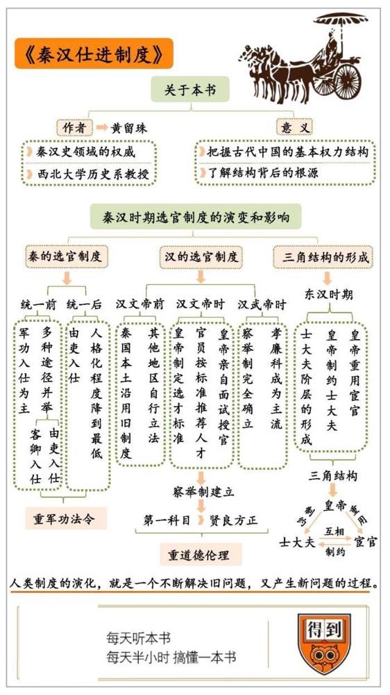 秦朝是中国历史上的第一个大一统王朝,但秦国创立的选官制度,却成为秦朝灭亡的原因之一。汉朝为了解决秦朝遗留下来的问题,创造了新的选官制度,这套制度在当时运行得很成功,但留下了一个后遗症。为了解决这个后遗症,皇帝不得不拉上宦官做帮手,前面说的大三角结构也就出现了。所以,今天这本书可以让你迅速把握古代中国的基本权力结构,还可以帮你了解这种结构背后的根源。
